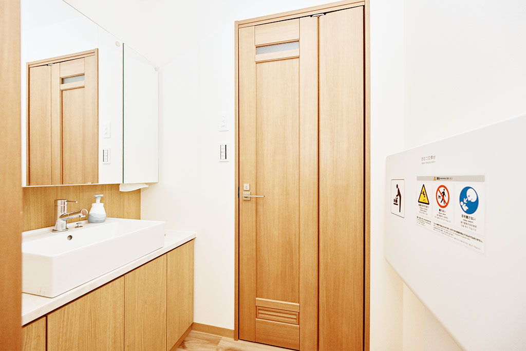 診療前の歯磨き、診療後の身だしなみチェック、お化粧直しなどにご利用いただけます。バリアフリー設計のため、車いすに座ったままお入りいただけます。